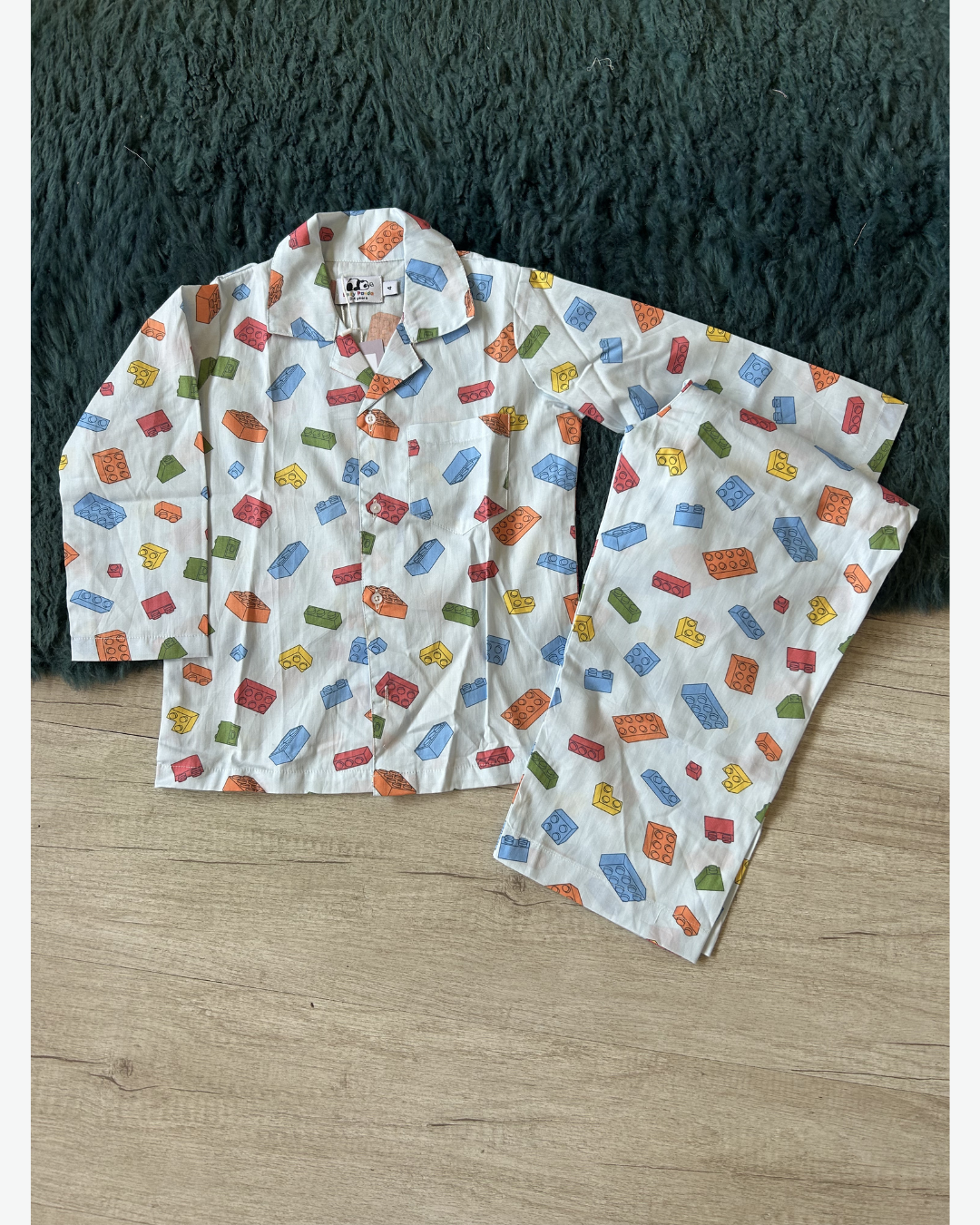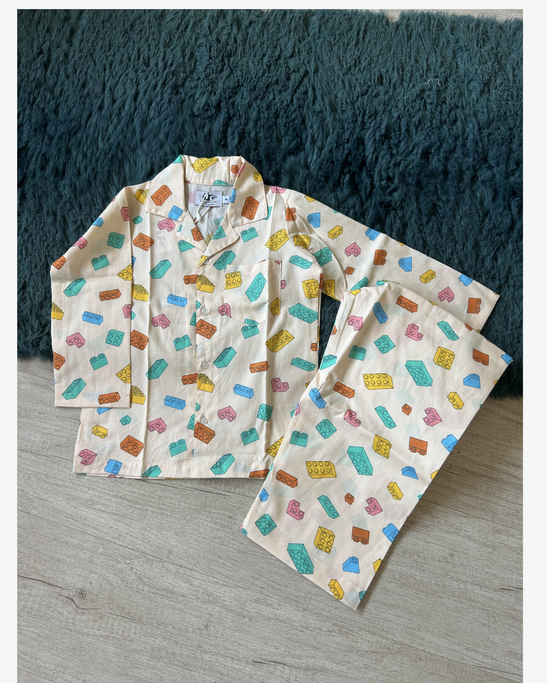 Stack up the fun at bedtime with this playful building blocks print cotton nightsuit. Made from soft, breathable fabric, it keeps little ones comfy for cozy evenings and restful sleep. The cheerful print and relaxed button-down style make it perfect for snuggles, stories, and dream-filled nights.