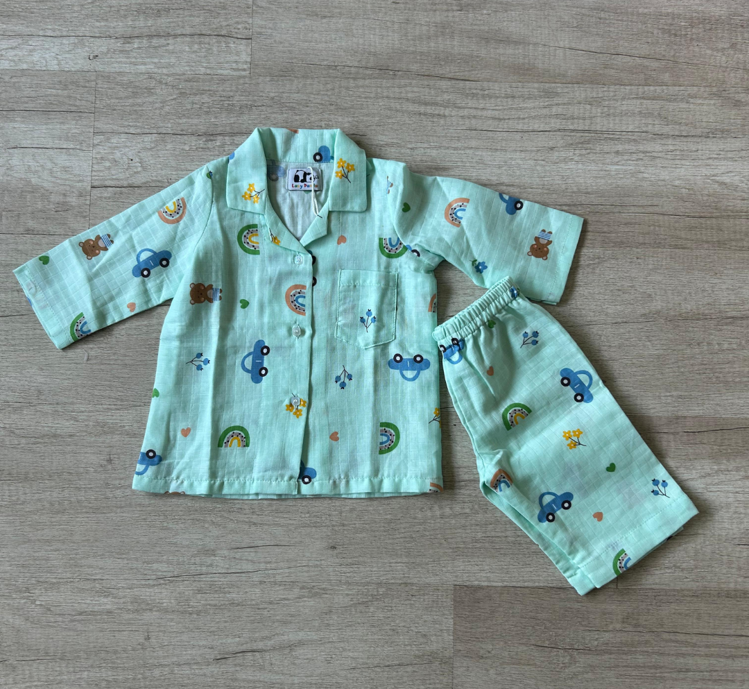Bright, cheerful, and made for cozy nights — this mint cotton nightsuit brings playful charm to bedtime. Featuring cute rainbows, cars, and tiny details, it’s crafted from soft breathable fabric for all-night comfort. The relaxed button-down style makes it perfect for snuggles, storytime, and drifting into happy dreams.